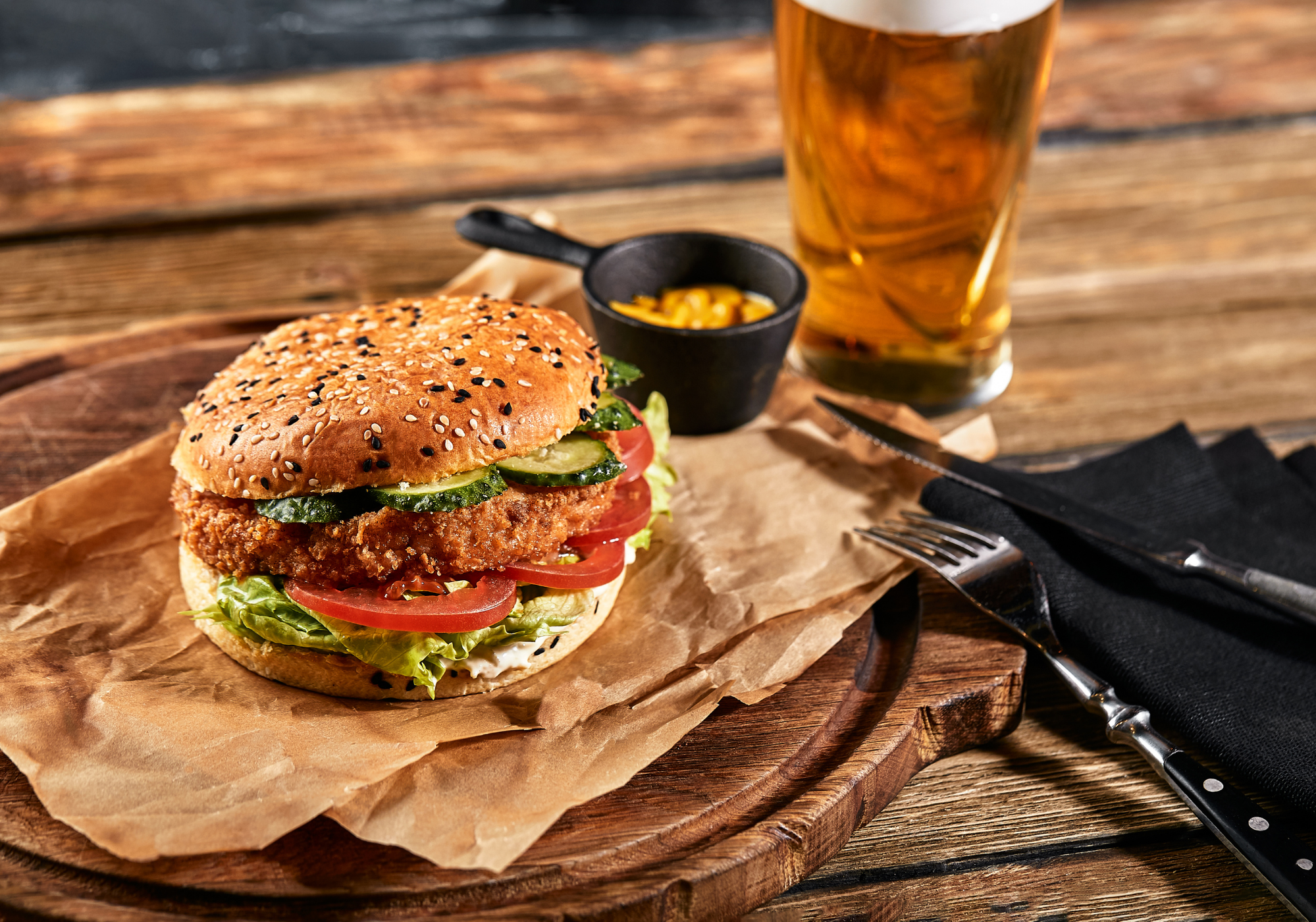 (150g vyprážané kuracie Crispy prsia, cheddar, kari omáčka, grilovaná slaninka, karamelizovaná cibuľka, volské oko, čerstvá paradajka, šalátová uhorka, baby špenát, domáca majonéza, 150g Libero hranolky) -